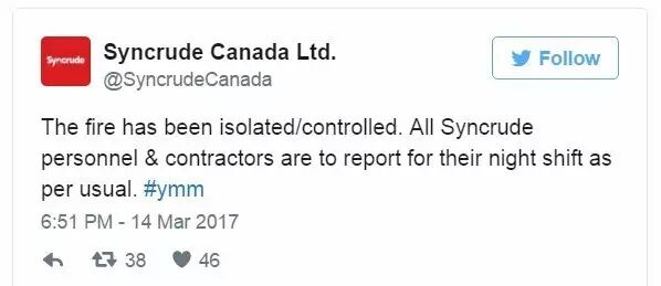 2015年8月份时,Mildred Lake油田也发生了一次爆炸事故,在那场事故过后,因为管道,电力和沟通系统都在爆炸中被损坏,导致该油田的产油量能力直线下降了80%,直到第二年的10月份,该油田才能恢复到正常产油量水平。